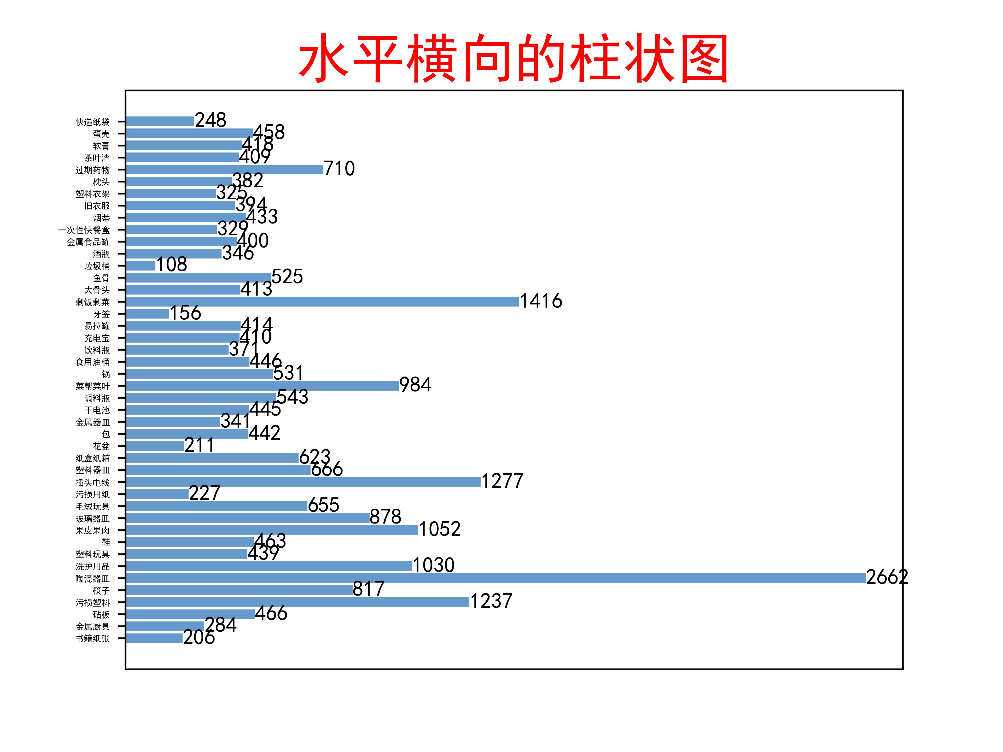 import osimport xml.dom.minidomAnnoPath = r'G:/Annotations/'Annolist = os.listdir(AnnoPath)rate = { } # 创建一个字典用于存放标签名和对应的出现次数total = 0for annotation in Annolist: fullname = AnnoPath + annotation print(fullname,annotation) dom = xml.dom.minidom.parse(fullname) # 打开XML文件 # print(fullname,annotation) print('---------------', total) collection = dom.documentElement # 获取元素对象 objectlist = collection.getElementsByTagName('object') # 获取标签名为object的信息 for object in objectlist: namelist = object.getElementsByTagName('name') # 获取子标签name的信息 objectname = namelist[0].childNodes[0].data # 取到name具体的值 if objectname not in rate: # 判断字典里有没有标签,如无添加相应字段 rate[objectname] = 0 rate[objectname] += 1 total += 1print(rate)print(total)f=open(r'G:\tiaozhansai\垃圾分类\VOCdevkit\count.txt','w',encoding='utf-8')keys=[]values=[]for key,value in rate.items(): f.write(key+':'+str(value)) keys.append(key) values.append(value)f.close()#画图import matplotlib.pyplot as plt# object = []# number = []# for key in rate:# object.append(key)# number.append(rate[key])# plt.figure()# #解决中文显示问题# plt.rcParams['font.sans-serif']=['SimHei']# plt.rcParams['axes.unicode_minus'] = False# plt.bar(object, number)# # plt.bar(number,object )## plt.title('result')# plt.show()#########################################plt.rcParams['font.sans-serif']=['SimHei']plt.rcParams['axes.unicode_minus'] = Falsefig, ax = plt.subplots()b = ax.barh(range(len(keys)), values, color='#6699CC')# 为横向水平的柱图右侧添加数据标签。for rect in b: w = rect.get_width() ax.text(w, rect.get_y() + rect.get_height() / 2, '%d' % int(w), ha='left', va='center')# 设置Y轴纵坐标上的刻度线标签。ax.set_yticks(range(len(keys)))ax.set_yticklabels(keys)# 不要X横坐标上的label标签。plt.xticks(())plt.title('水平横向的柱状图', loc='center', fontsize='25', fontweight='bold', color='red')plt.savefig(r'G:\tiaozhansai\垃圾分类\VOCdevkit\count.jpg')plt.show() 将代码写成脚本count_class.py后运行,可以得到以下效果: